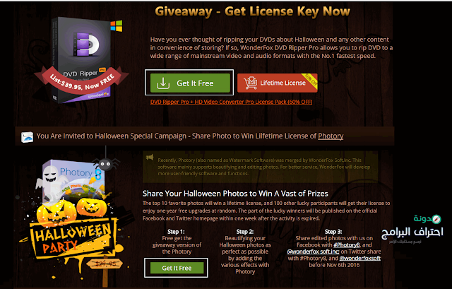 أولا اصدقائي سوف تقوم بالدخول إلى رابط صفحة العرض (الرابط في الاسفل) بعد ذلك ستقوم بالنزول قليلا سيظهر لك العرض الخاص ببرنامج "DVD Ripper Pro و Photory" وبالنقر على زر "Get It Free" سوف يبدا التحميل مباشرة لكل برنامج .